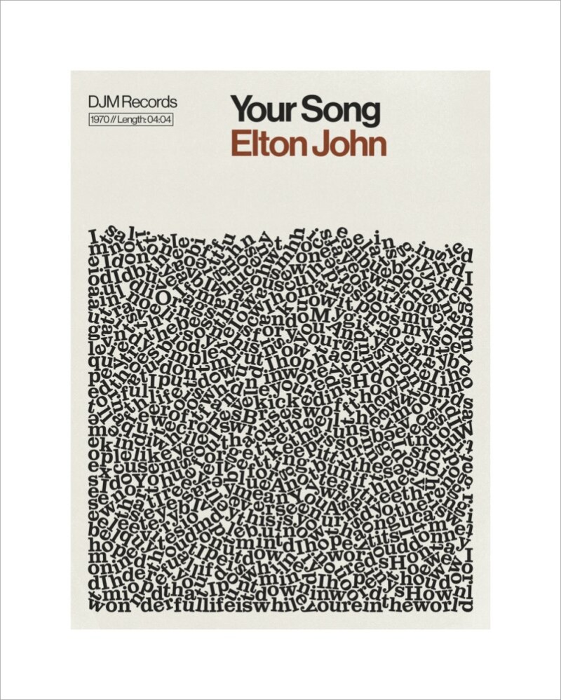 "Your Song" by Reign & Hail is a stylish art print inspired by the timeless ballad from Elton John. This design captures the essence of the song’s heartfelt lyrics and iconic melody, combining vibrant colours with bold typography to create a piece that resonates with fans of Elton John's music. Ideal for those who appreciate classic music and contemporary design, this print brings a touch of musical nostalgia and elegance to any room.