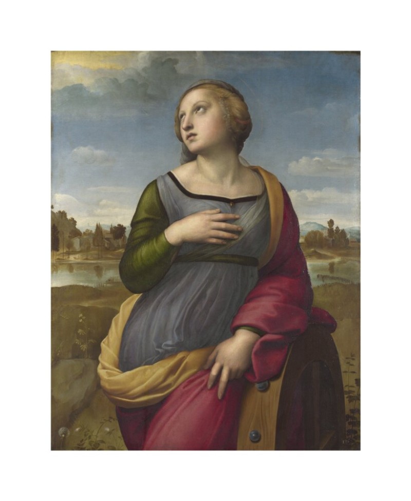 Saint Catherine of Alexandria by Raphael is a masterful portrayal of the Christian martyr and scholar, known for her wisdom and devotion. Painted during the High Renaissance, this artwork showcases Raphael’s signature grace and balance, with Saint Catherine gazing upward in a moment of serene contemplation. The delicate composition, combined with Raphael’s expert use of light and colour, highlights both her physical beauty and spiritual strength. The subtle detail in her flowing robes and the symbolic spiked wheel at her side add depth to this classic depiction of faith and martyrdom.