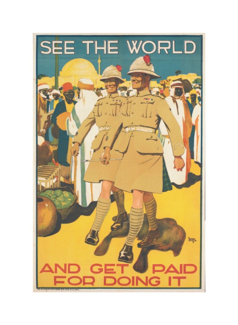 Explore a fascinating piece of post-WWI history with See the World, a British Army recruitment poster designed by Alfred Leete in 1919. Known for his bold and evocative designs, Leete crafted this poster to appeal to men seeking new opportunities after the war. The artwork depicts two British infantrymen walking through a vibrant, bustling Eastern Bazaar, surrounded by local traders and exotic goods, symbolising the allure of travel and adventure. This vintage reproduction preserves the rich detail and iconic style of the original, capturing the sense of promise and exploration marketed to young men at the time. Perfect for collectors of military history, vintage advertising, and Alfred Leete's works, See the World offers a unique glimpse into early 20th-century British graphic design and recruitment strategy.