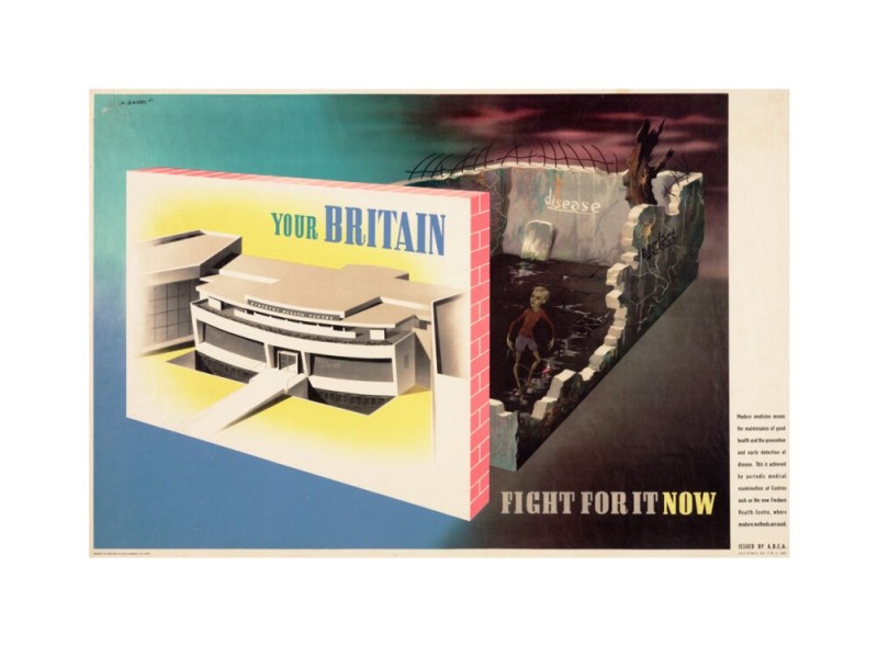 Own a piece of British history with this Your Britain - Fight for it Now (Health Centre) poster by renowned designer Abram Games. Created during World War II as part of a series commissioned by the British government, this powerful poster envisions the promise of post-war healthcare reform. Games’s artwork contrasts wartime hardship with the potential for modern health facilities, urging citizens to support the vision of a healthier, rebuilt Britain. Known for his minimalist style and impactful messaging, Games captures the hope and resilience of the British people.