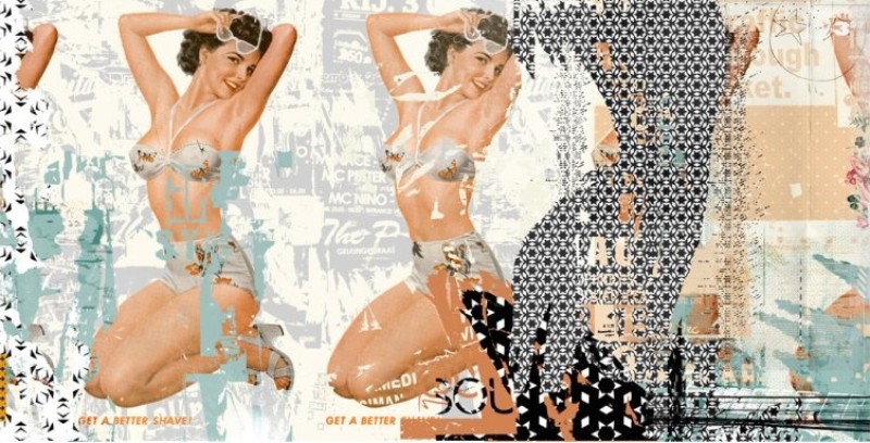 "Double Pinup" by Teis Albers is an eye-catching art print that merges vintage aesthetics with contemporary collage techniques. This captivating piece features two pin-up models set against a backdrop of layered textures and vibrant elements, making it an ideal choice for those who appreciate retro-inspired art with a modern twist.