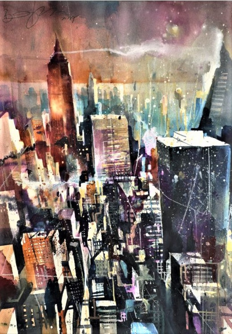 NY from the Rock art print by Bernard Vogel captures the essence of New York City's bustling urban landscape, Vogel, an internationally renowned Austrian painter and etcher, brings his artistic vision to life with this cityscape depiction. The artwork showcases the iconic skyline of Manhattan, portraying the dynamic energy and architectural splender of the city useing the medium of water colour.
