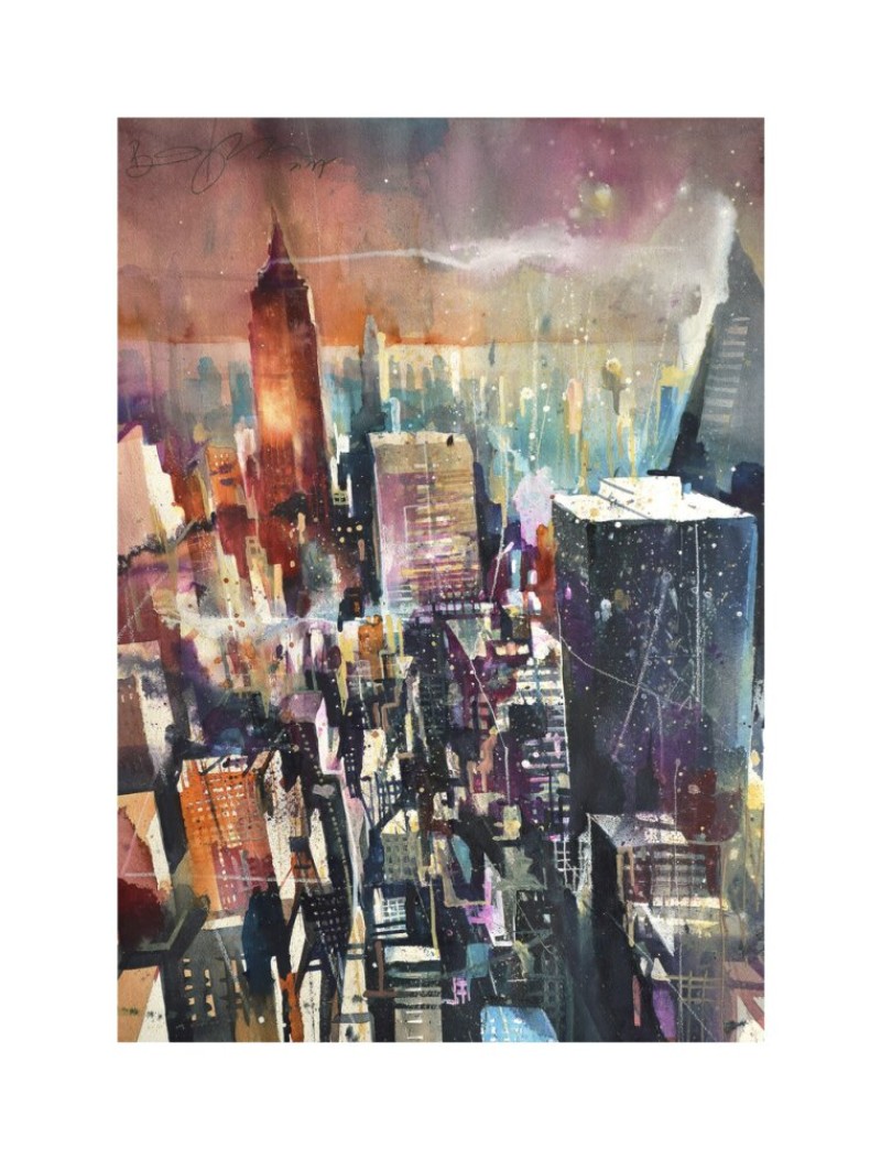 NY from the Rock art print by Bernard Vogel captures the essence of New York City's bustling urban landscape through the unique medium of water colour. Vogel, an internationally renowned Austrian painter and etcher, brings his artistic vision to life with this cityscape depiction. The artwork showcases the iconic skyline of Manhattan, portraying the dynamic energy and architectural splendour of the city.