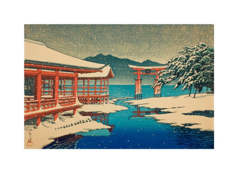 Miyajima Shrine in Snow by Hasui Kawase captures the quiet beauty of Japan’s iconic torii gate and shrine landscape under a blanket of snow. Created in the Shin-hanga style, this atmospheric woodblock design evokes serenity and timeless elegance. Available as a premium fine art print, ideal for refined interiors.