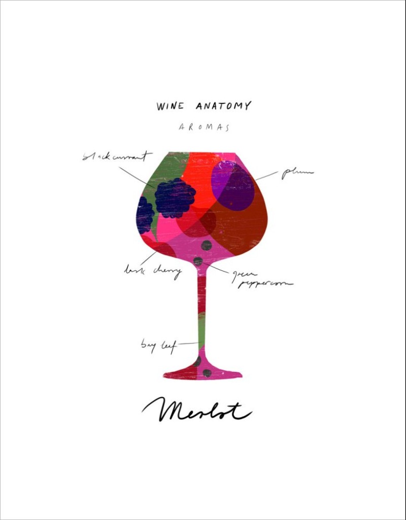 Fun and stylish infographic artwork Wine Anatomy: Merlot. A contemporary art print for wine lovers and modern kitchens.