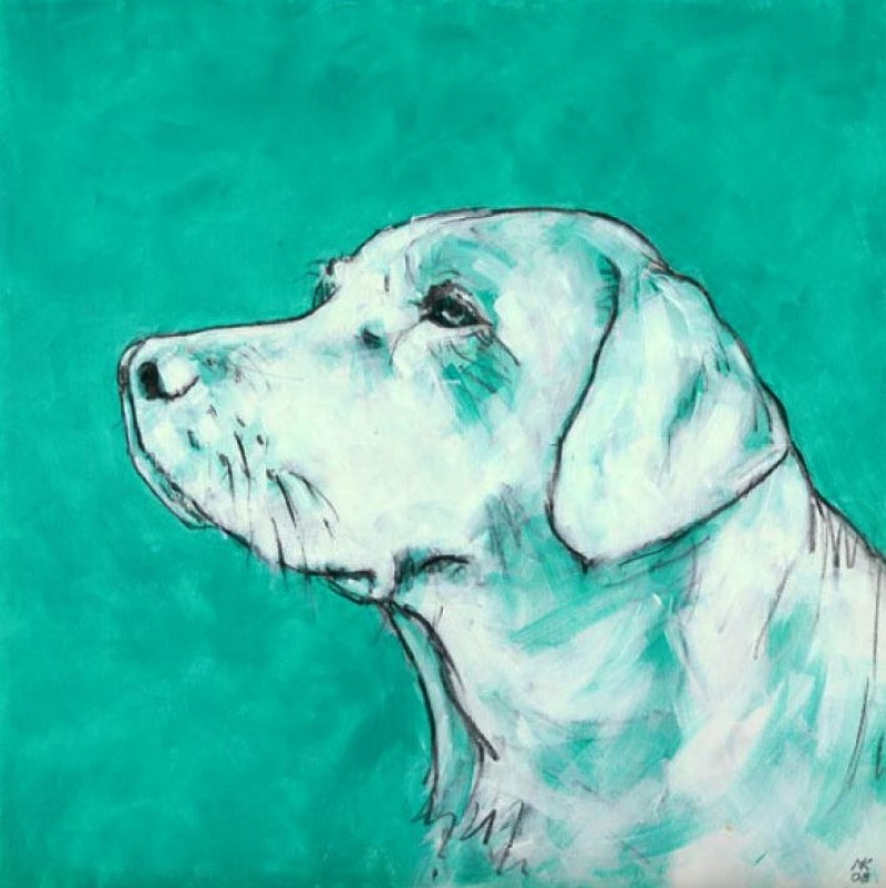 "Labrador on Turquoise," an art print by Nicola King. This delightful piece features a lovable Labrador set against a vibrant turquoise background, capturing the playful and loyal spirit of this beloved breed. Perfect for dog lovers and fans of contemporary art, this print brings a pop of colour and whimsy to any room.