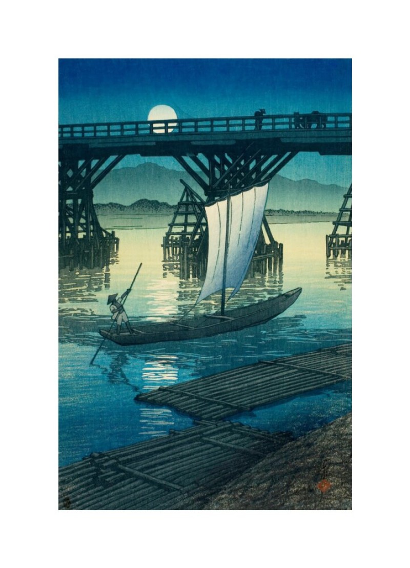 A beautiful reproduction of Asahi Bridge, Ojiya by Hasui Kawase, originally created as part of the Japanese Shin-hanga movement. This atmospheric landscape print captures serene colour and refined detail, making it ideal for contemporary interiors. Available in multiple sizes framed or unframed.