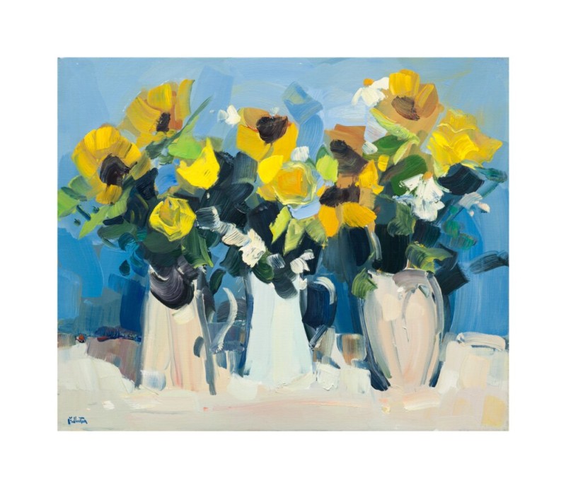 Sunflower Still Life Art Print by James Fullarton presents a vivid and captivating portrayal of sunflowers in a still life composition. Known for his bold brushstrokes and vibrant use of colour, Fullarton masterfully captures the rich yellows and oranges of the sunflowers, creating an uplifting and dynamic representation of the beloved flower. The textured, painterly approach brings depth and movement to the piece, while the sunflowers' golden hues seem to radiate warmth and light. This expressive floral artwork is perfect for adding a cheerful, nature-inspired touch to any room, making it ideal for both contemporary and traditional interiors.