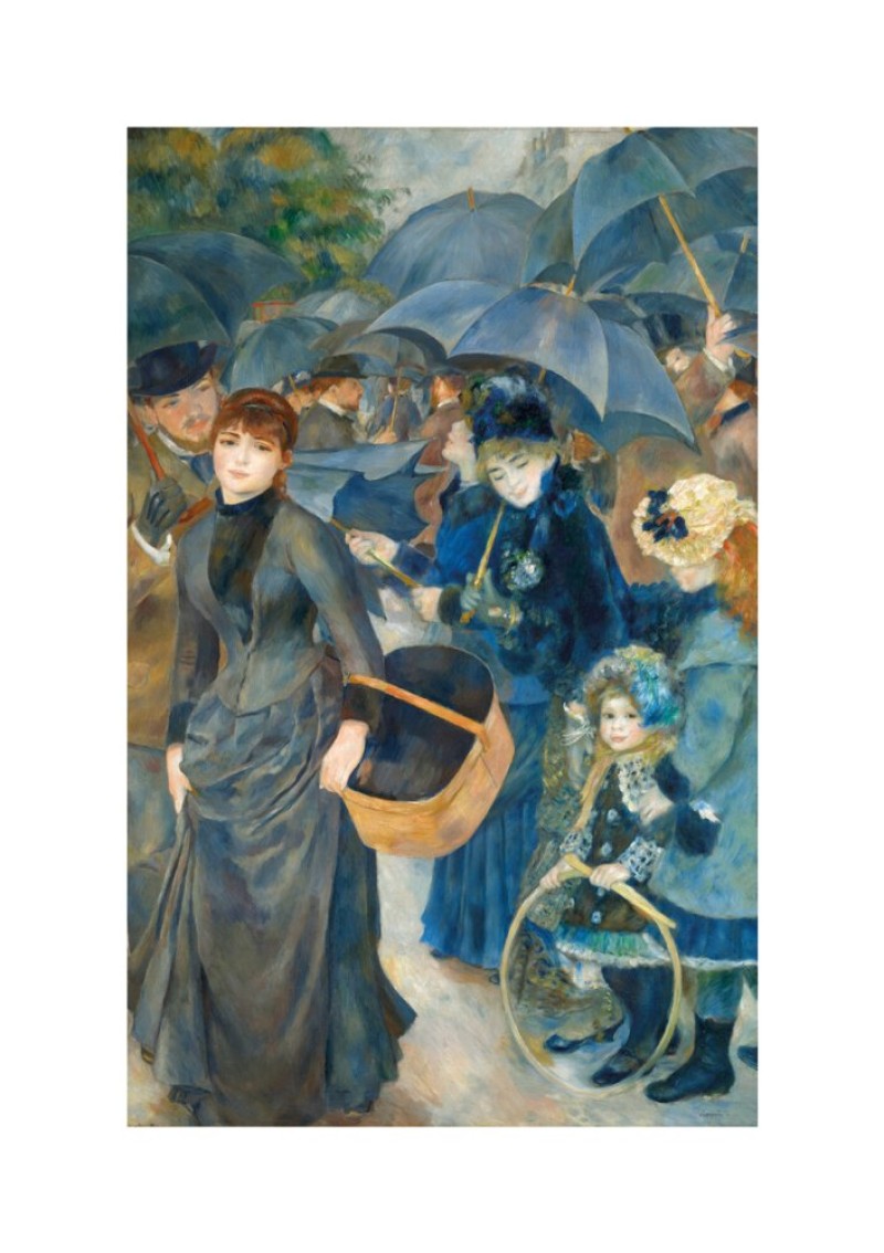 The Umbrellas by Pierre-Auguste Renoir is a captivating portrayal of everyday life in Paris, showcasing the artist's mastery of colour and light. Painted in 1881, this iconic Impressionist work features a lively street scene filled with figures holding vibrant umbrellas, creating a sense of movement and spontaneity. The composition beautifully balances the interactions of men, women, and children, all set against a backdrop of bustling urban life.