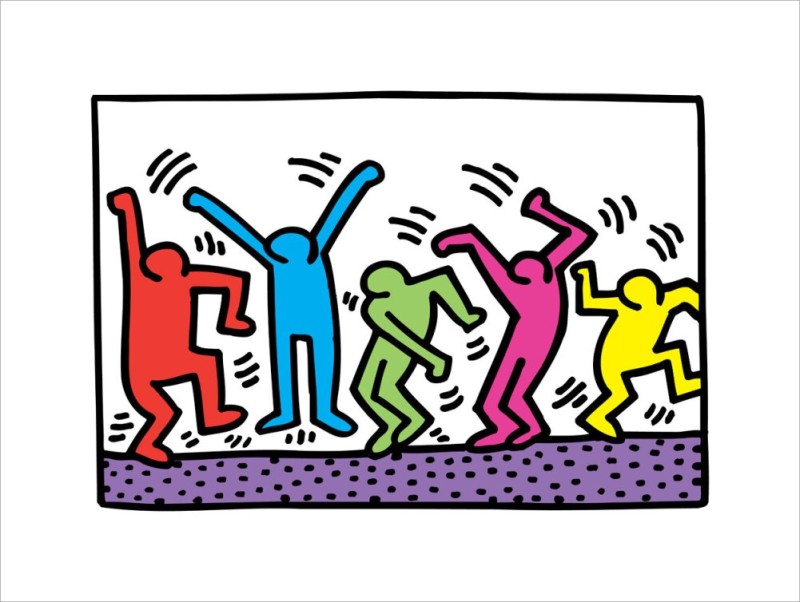 Untitled (Dance) art print by Keith Haring , a lively piece that captures the essence of movement and joy through his iconic style. Perfect for adding a touch of contemporary art to any space, Around the time Keith Haring's artworks gained popularity, hip hop was emerging in New York City. Inspired by its upbeat rhythms, Haring created "Untitled (Dance)," featuring four animated figures with lines surrounding their silhouettes to convey movement and energy.